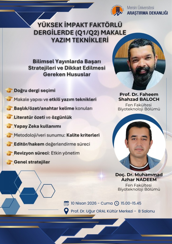 Mersin Üniversitesi Araştırma Dekanlığı, akademisyenlerin ve lisansüstü araştırmacıların uluslararası bilimsel yayın performansını artırmaya yönelik önemli bir etkinliğe ev sahipliği yapıyor. “Yüksek İmpakt Faktörlü