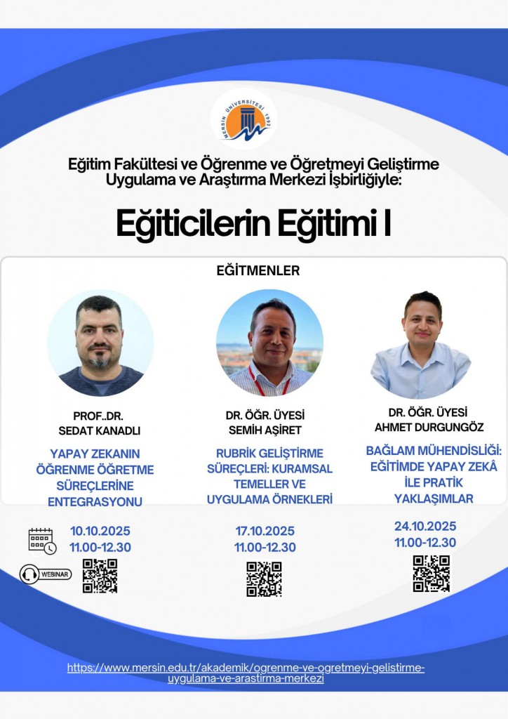 Mersin İl Milli Eğitim Müdürlüğü ve Mersin Üniversitesi iş birliğiyle Fakültemiz öğrencilerine yönelik Fatih Projesi, EBA, MEBİ ve Eğitimde Yapay Zekâ konularında bilgilendirme seminerleri düzenlendi. İki gün süren v
